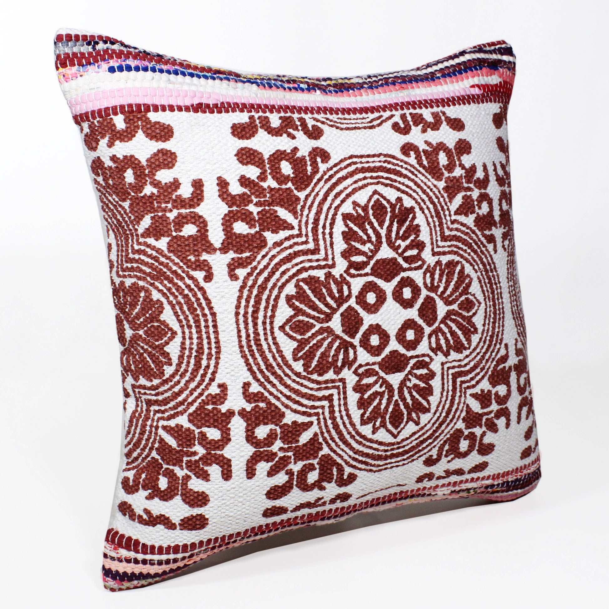 Designed to stand alone or layer with other accents, this throw pillow brings a cohesive style you will love. This everyday accent merges well with multiple decor styles from modern to casual to boho to shabby chic. The bordering cotton chindi hues will vary as these recycled cotton fabrics have different tones throughout but will still be in the coordinating color family. Crafted with care in India, each accent pillow is unique with its very own individuality. 70% Cotton and 30% Polyester. Flat Woven Closure: Zipper. Depth: 7.5