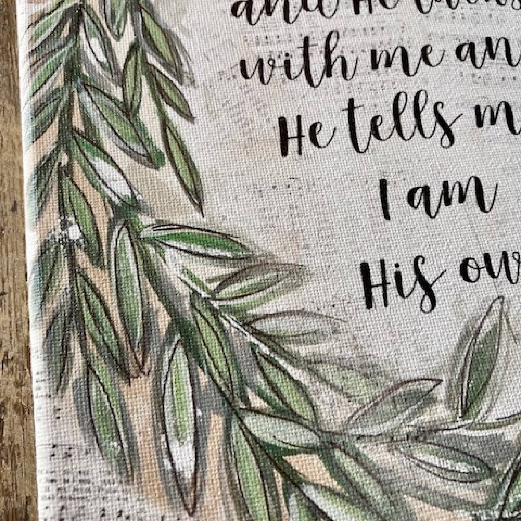 Floral wreath print on vintage traditonal hymnal pages with the old church song "And He Walks with Me and He Talks with me and He tells me I am His Own" hyrics. Beautiful Home Decor for any room... Living Room Decor, Entry Way, Home Office, Bathroom or Bedroom. Canvas print is wrapped around a lightweight wooden frame. Canvas has a 1/2" raised unprinted edge.