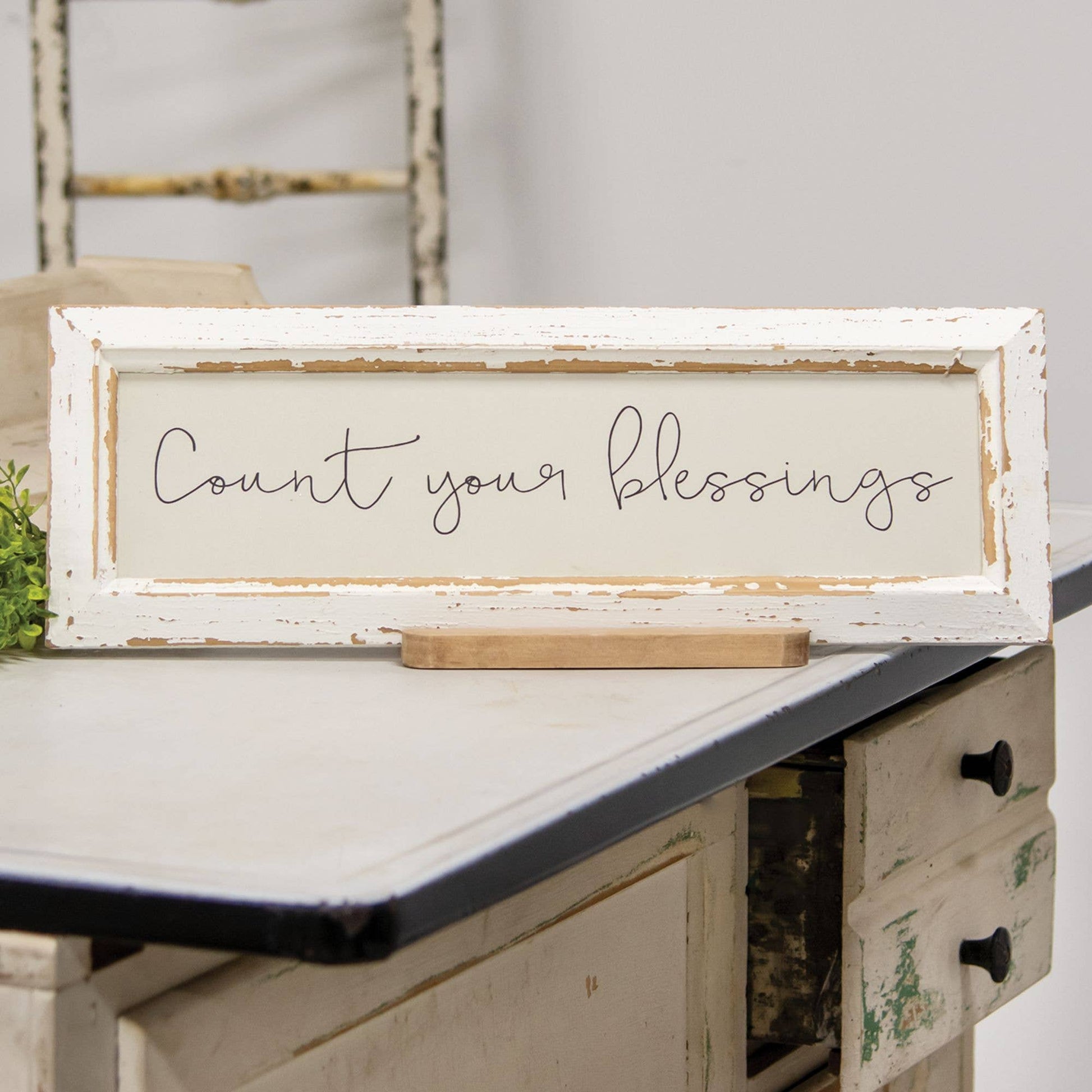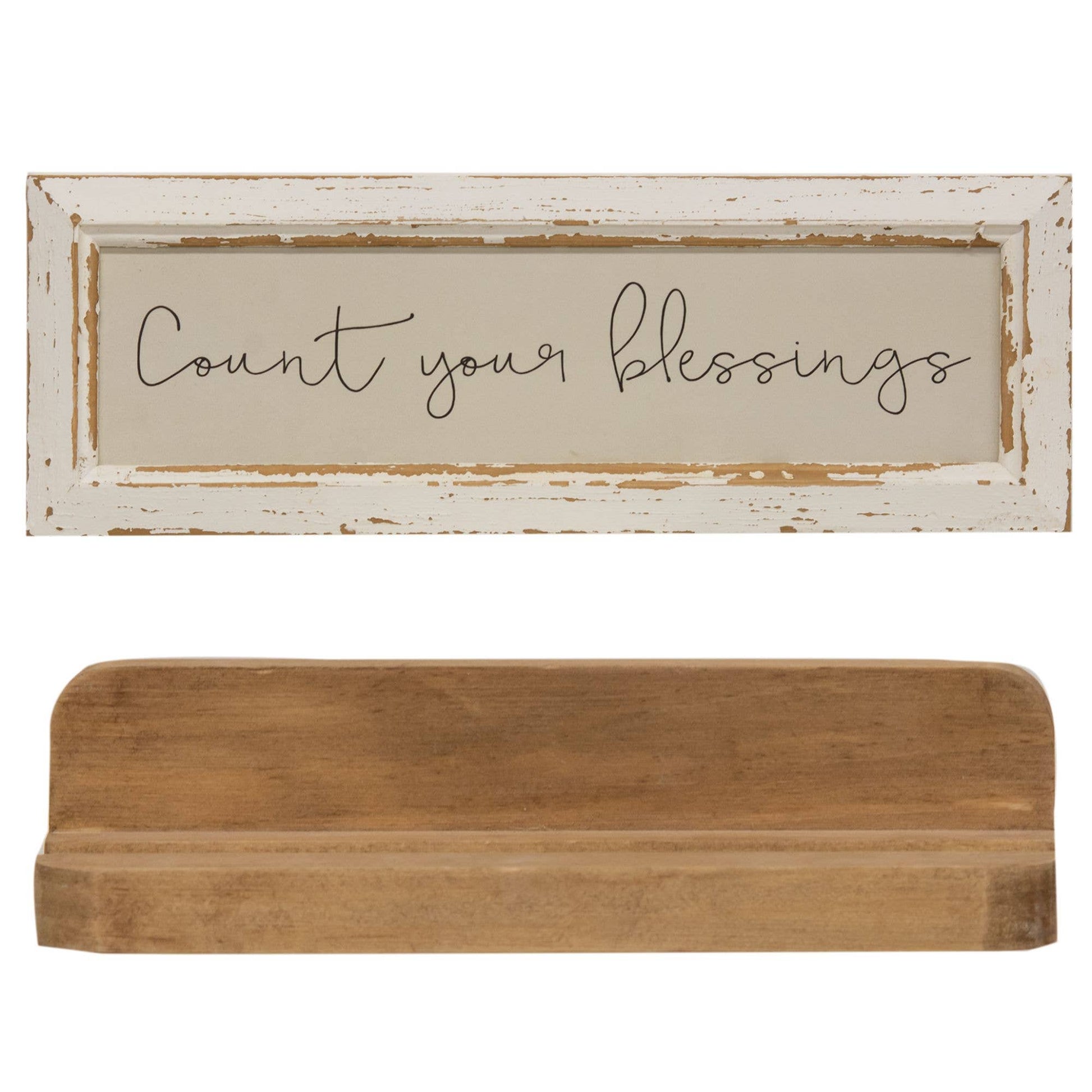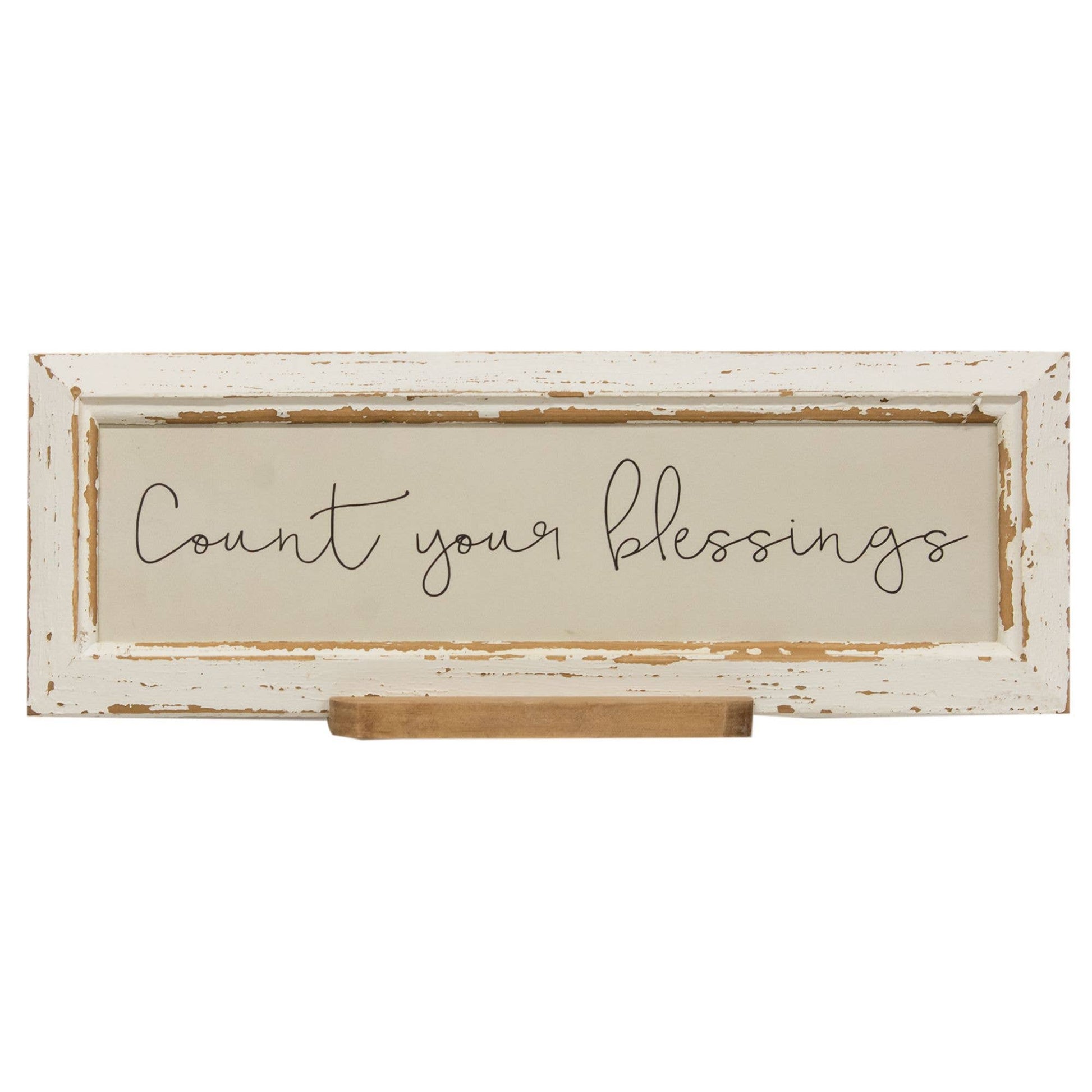Count Your Blessings Distressed Frame with Holder is a framed wooden sign with a distressed white finish. Sign reads, "count your blessings" in black script lettering and it comes with a wooden holder for display on flat surfaces like shelves and tabletops. Frame is perfect for primitive and rustic decorating and it measures 6" high by17" wide by .25" deep.