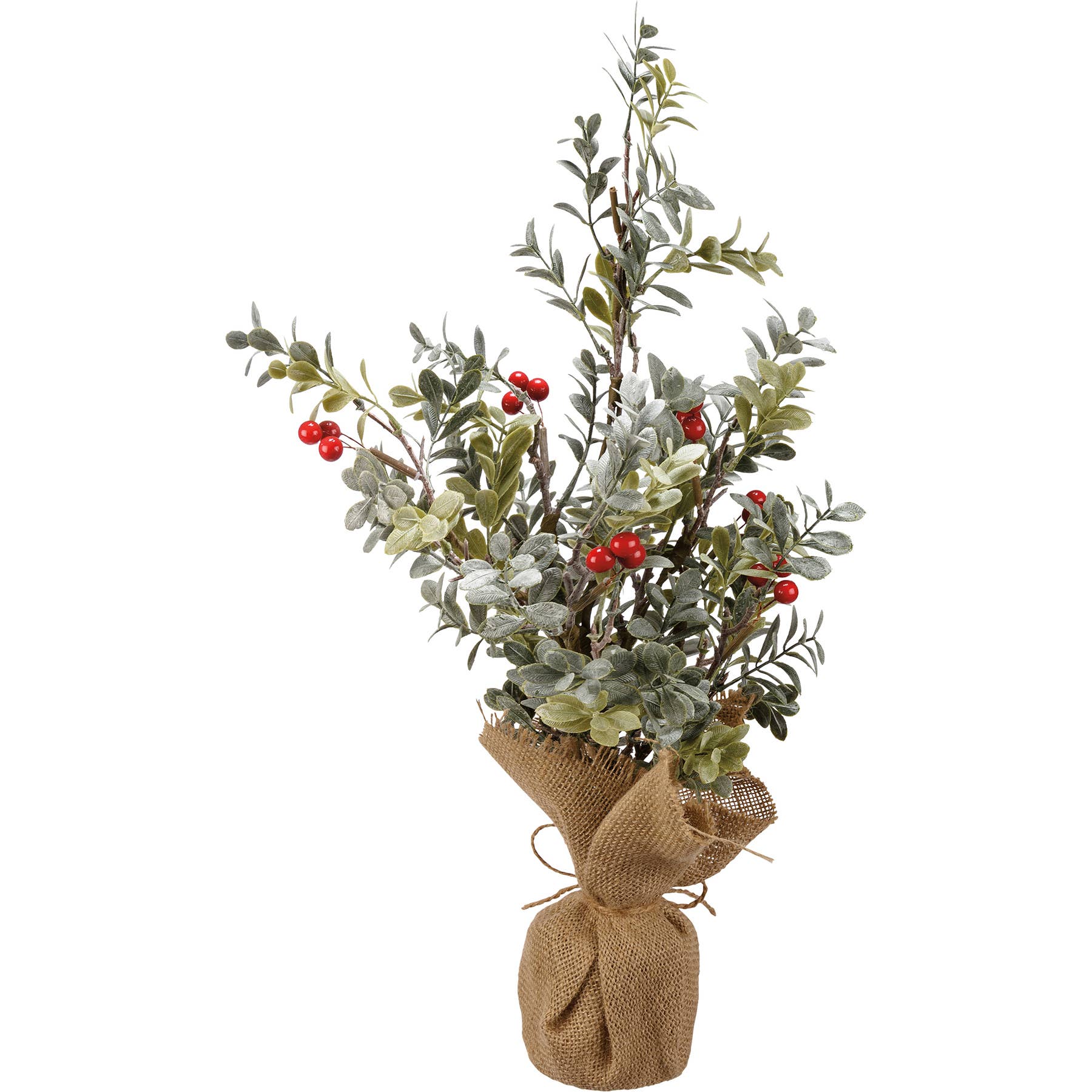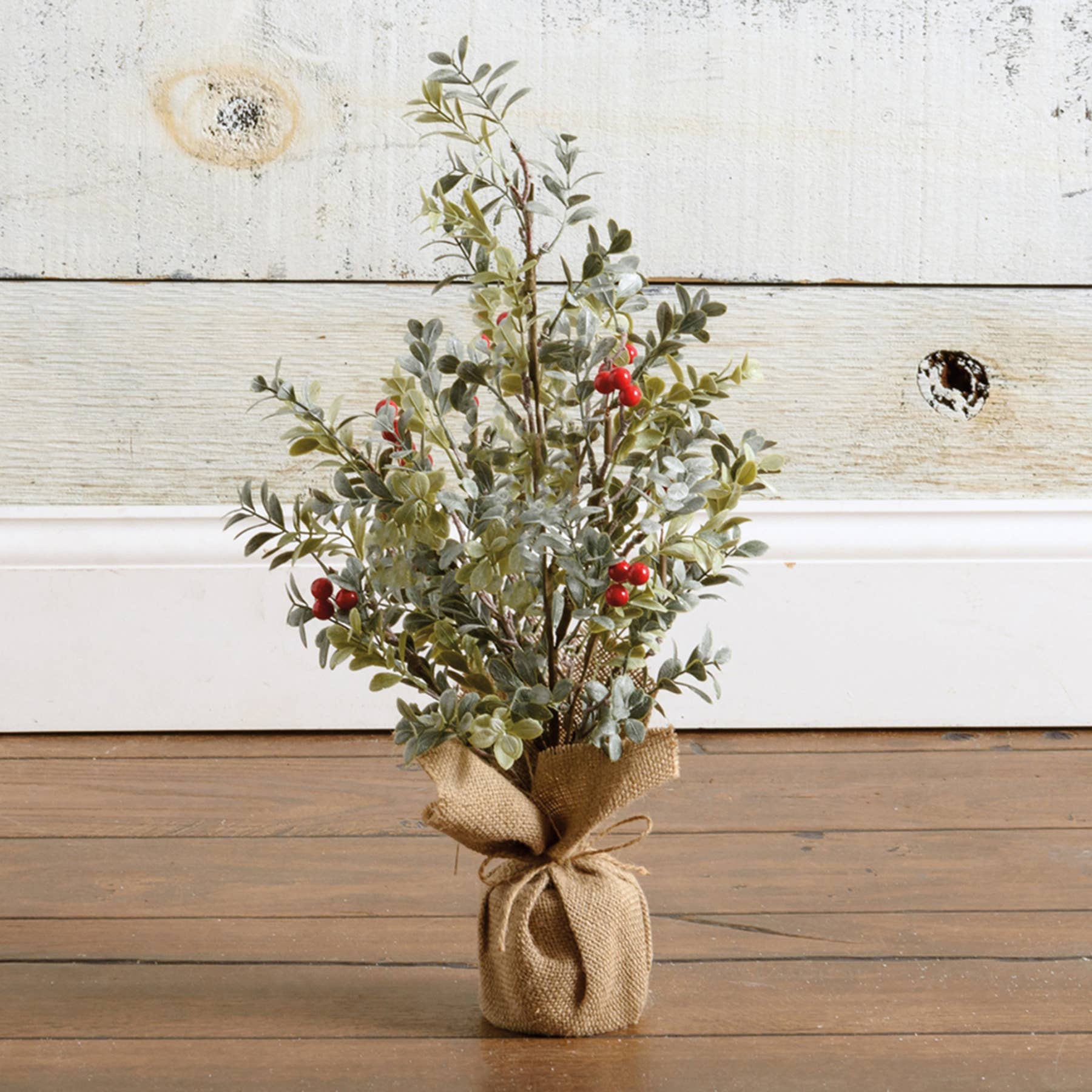 A medium faux tree featuring eucalyptus leaves, berries, and a burlap-wrapped base for added interest.