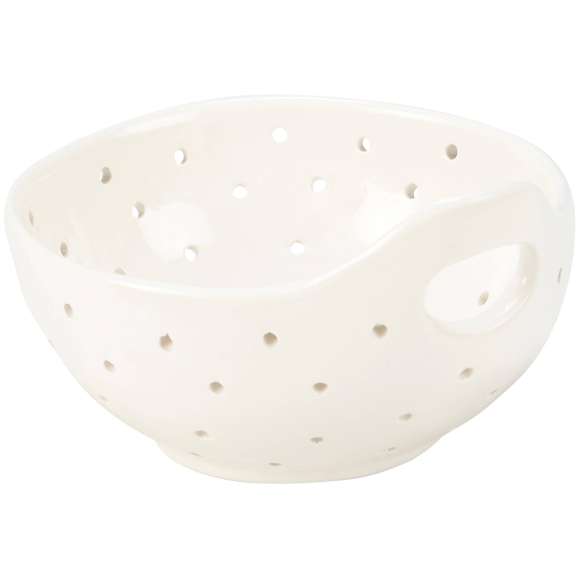 A stoneware berry bowl from our Farmhouse Collection ideal for holding fruit. Berry bowl features handle for easy carrying and accent holes throughout. Bowl can be used to serve food or for decorative accents in a rustic home décor display. Hand wash only. Our Farmhouse berry bowl is a piece of rustic tableware perfect for everyday use.