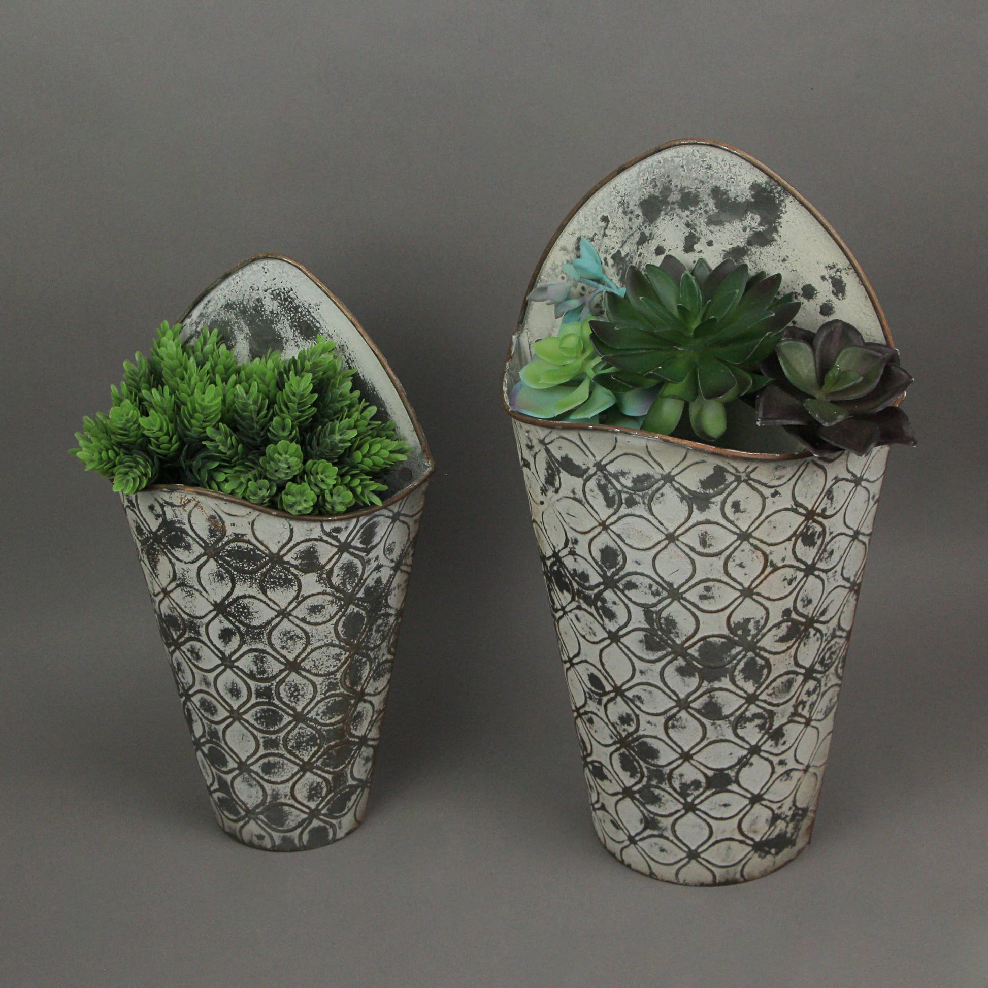 Elevate your home decor with a dash of farmhouse charm using this delightful pair of light gray enamel-painted metal wall pockets. The embossed floral pattern exudes a country feel, while the distressed finish imparts a weathered patina, adding a touch of creative boho flair to your space. These wall pockets serve as both decor and planters, ideal for showcasing vibrant green plants, trailing vines, or cascading florals. Crafted for versatility, these pockets effortlessly bring nature indoors. For those without a green thumb, they offer the perfect canvas for arranging silk greenery or dried florals, bringing a sense of the outdoors to your living space. The larger pocket, measuring 16 inches high, 8.5 inches long, and 4 inches wide, features an interior depth of 11.75 inches. Meanwhile, the smaller one, measuring 13.25 inches high, 7.5 inches long, and 3.5 inches wide, boasts an interior depth of 9.5 inches.