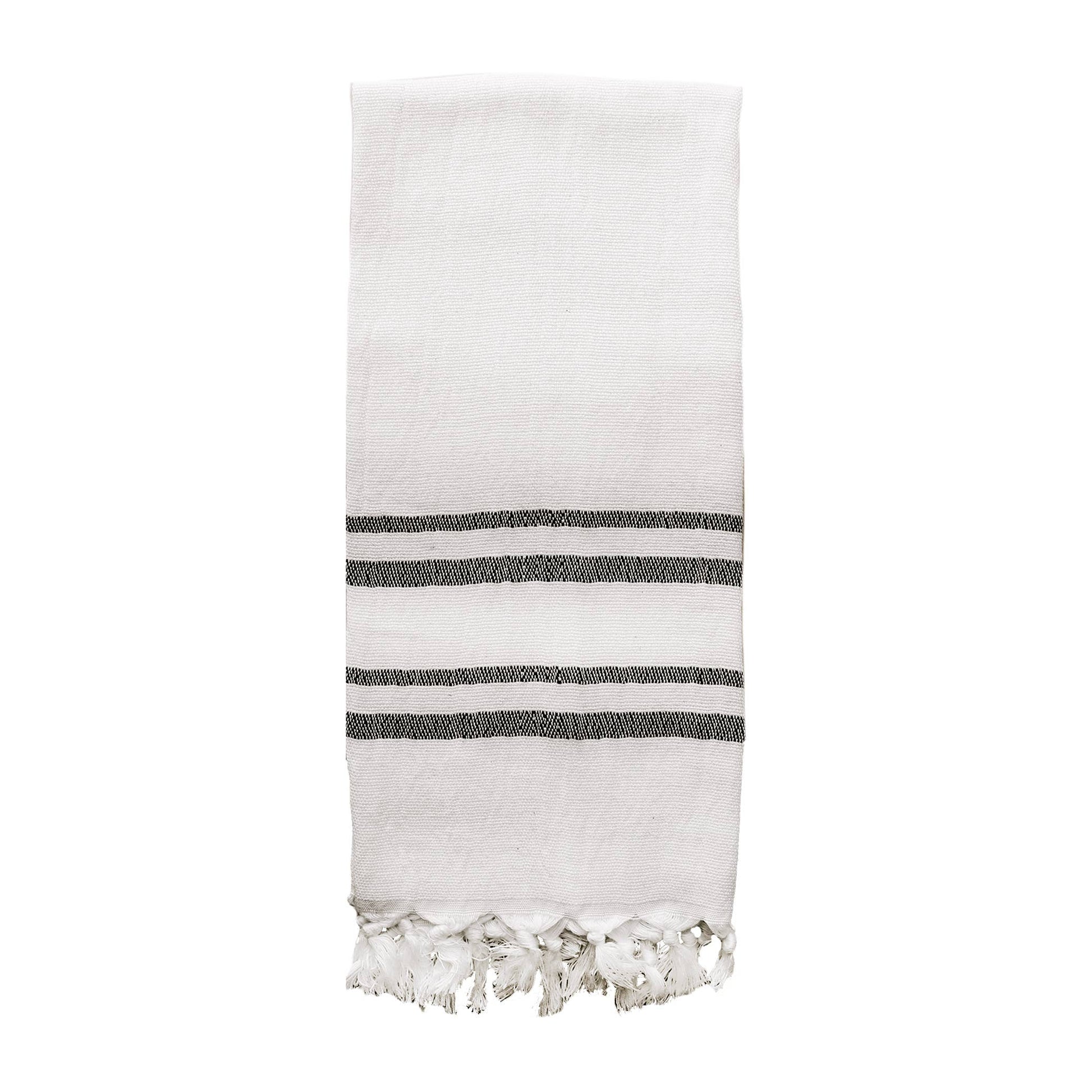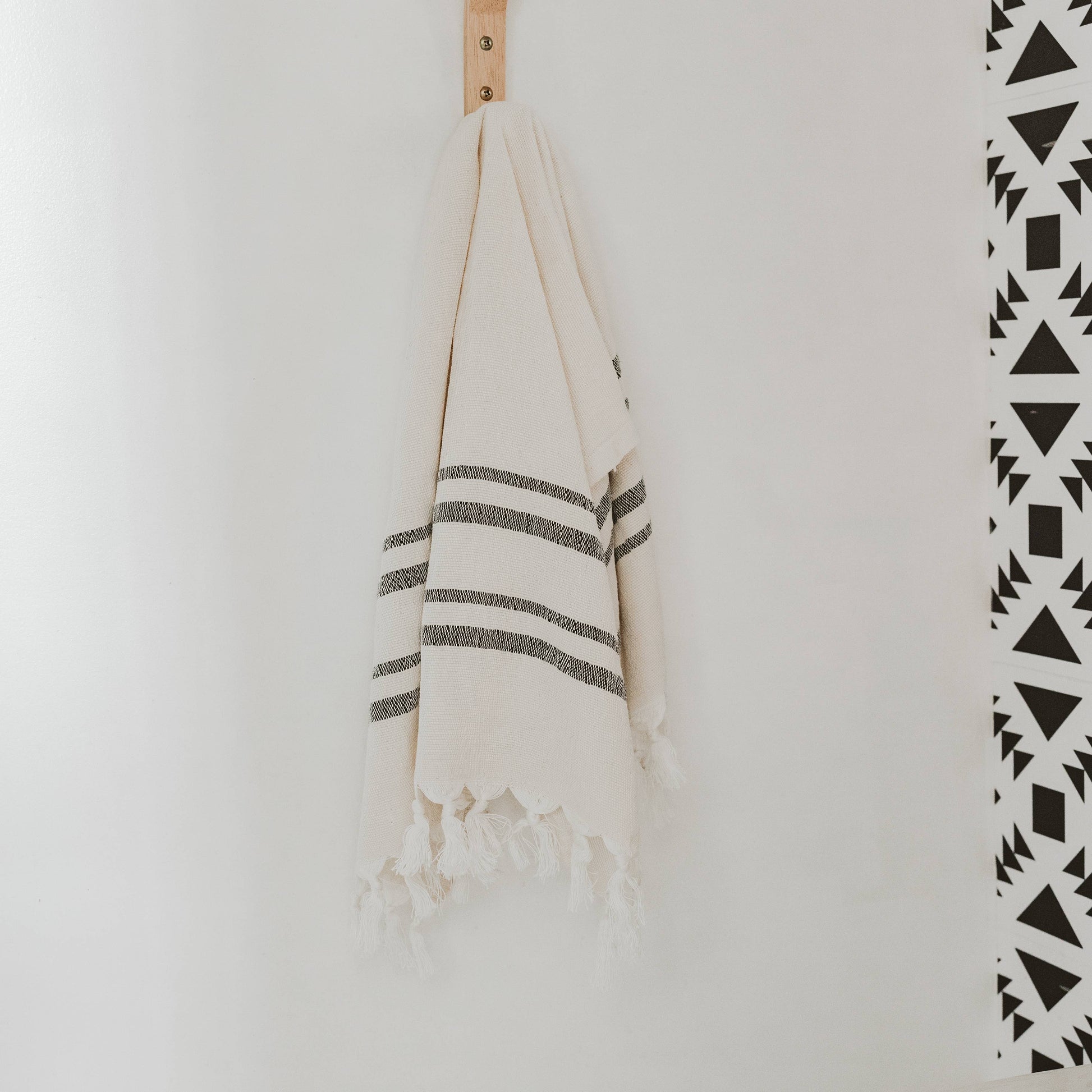 Our generously oversized, super soft, Turkish Cotton + Bamboo Towels are ideal for use as hand towels, kitchen towels, bath, or hair towels, toddler/baby towels, and more. This quick drying towel will become softer and more absorbent with each wash. Each towel is unique and my vary slightly in size, color, and weight. DETAILS: • Size: Approximately 19 x 35" • Color: Natural with Black Stripes (may appear cooler or warmer in color depending on light) • Hand Woven on Wooden Loom • Turkish Cotton + Bamboo • Made in Turkey • CARE: • Machine Wash Cold + Tumble Dry Low Heat • Do Not Use Hot Iron, Fabric Softener, or Bleach • Do Not Dry Clean