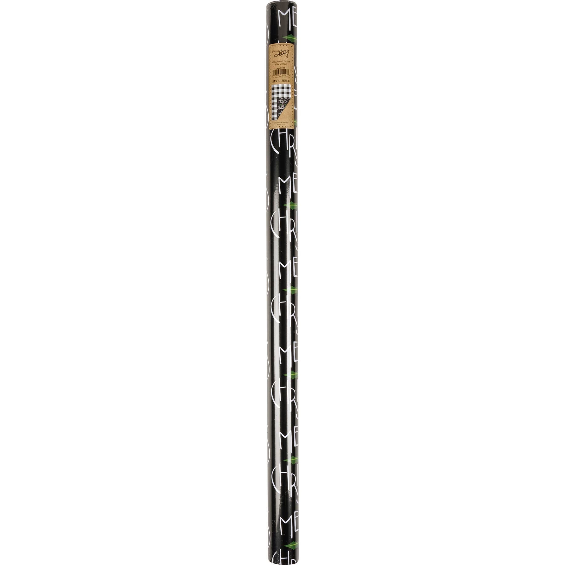 A roll of double-sided gift wrap featuring "Merry Christmas" sentiment and mistletoe design on one side, and black and white buffalo check design on the other side. Our Merry Christmas gift wrap roll is 9.8' long (about 3.3 yards).