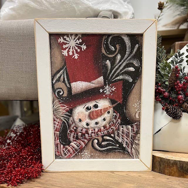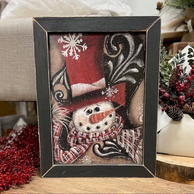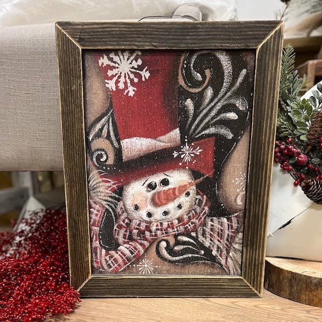 This picture is called "Burlap Snowman Red Top Hat". The print unframed measures 12x16 inches. The frame will add about one more inch per side. Beautiful print with multiple frame selections to choose from. Choose your lath frame color to customize your product. This primitive print has a burlap background with a snowman's head. The snowman is wearing a large red top hat and a plaid scarf. A few large snowflakes surround the snowman. A great print to add to your home during the winter season! All frames have a vintage wire along the top of the frame for quick and easy wall hanging.
