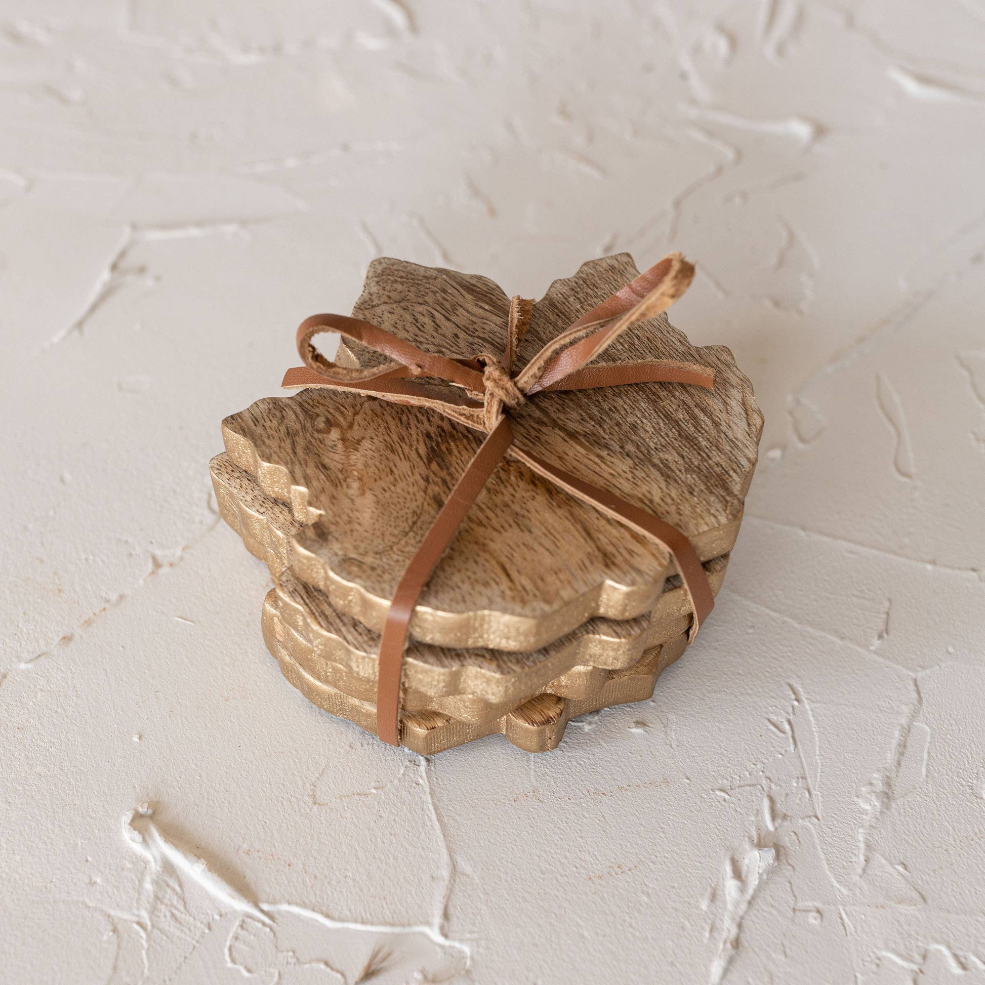 Your house guests will love the botanical style of these leaf coasters that come in a set of four. The familiar maple leaf shape adds a touch of cozy fall to your traditional entertaining decor. Each coaster is made with natural mango wood and finished with hand painted brass edging.