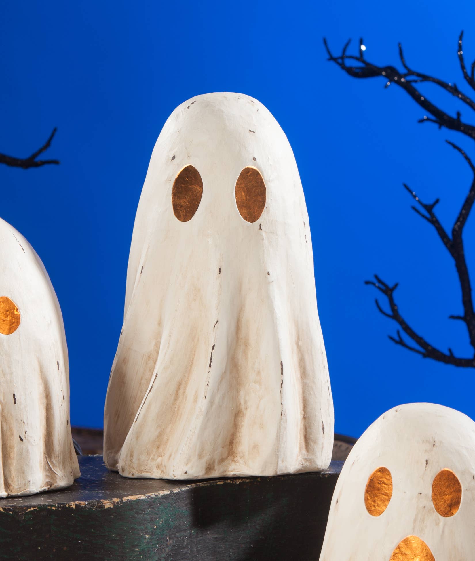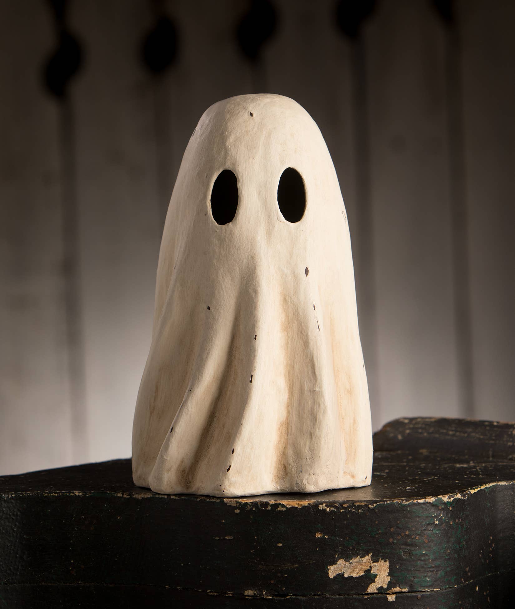 Light up the night with this tall ghost Luminary. This is made of paper mache and is perfect for setting over a battery operated candle. Candle not included.