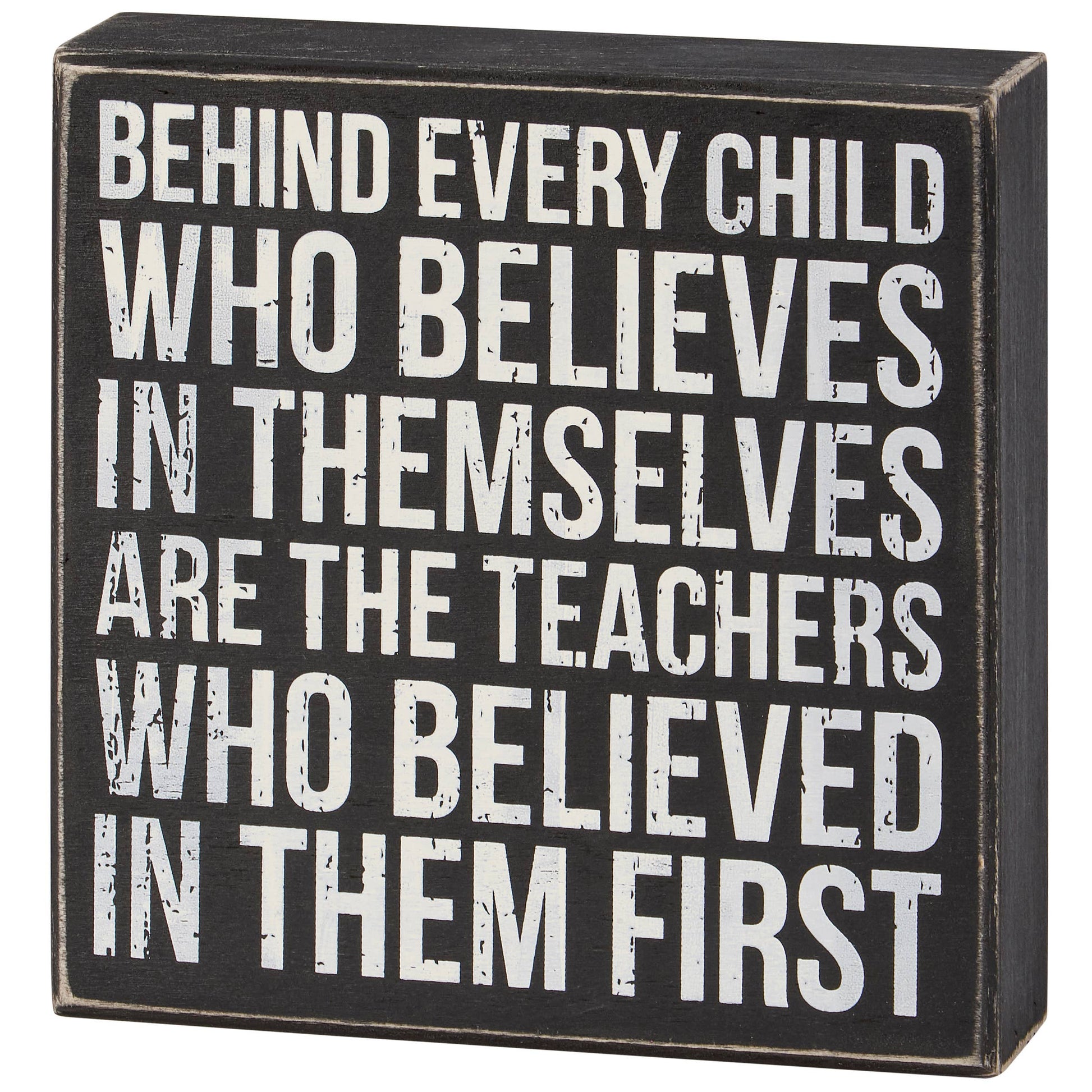 A classic black and white wooden box sign from our Teacher Collection displaying an inspirational teacher-themed sentiment that reads "Behind Every Child Who Believes In Themselves Are The Teachers Who Believed In Them First." Teacher box sign features distressed details with coordinating black color on sides and back. Our Teachers Believed box sign is easy to hang or can free-stand alone. An inspirational teacher gift that can be easily displayed in a classroom or on a desk.