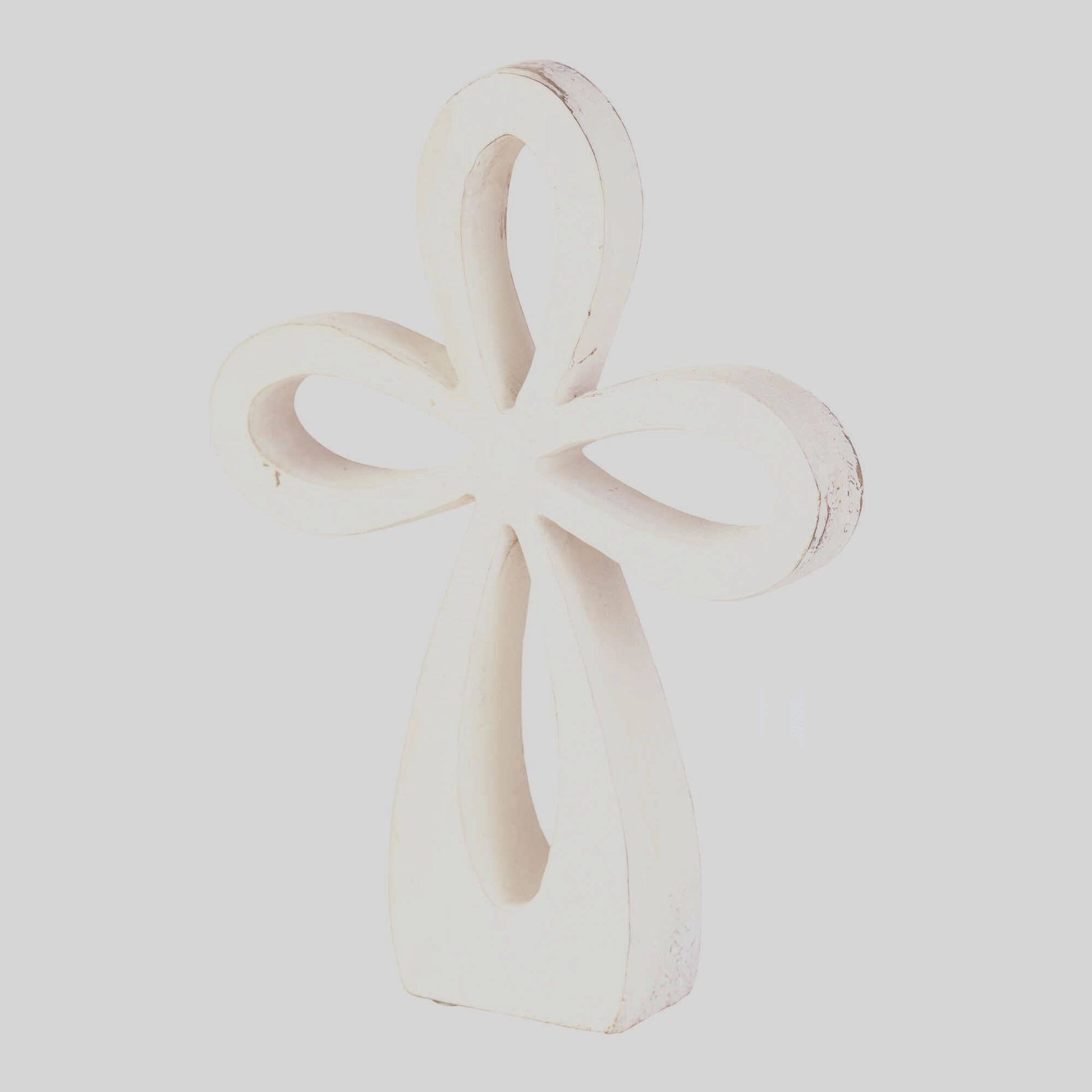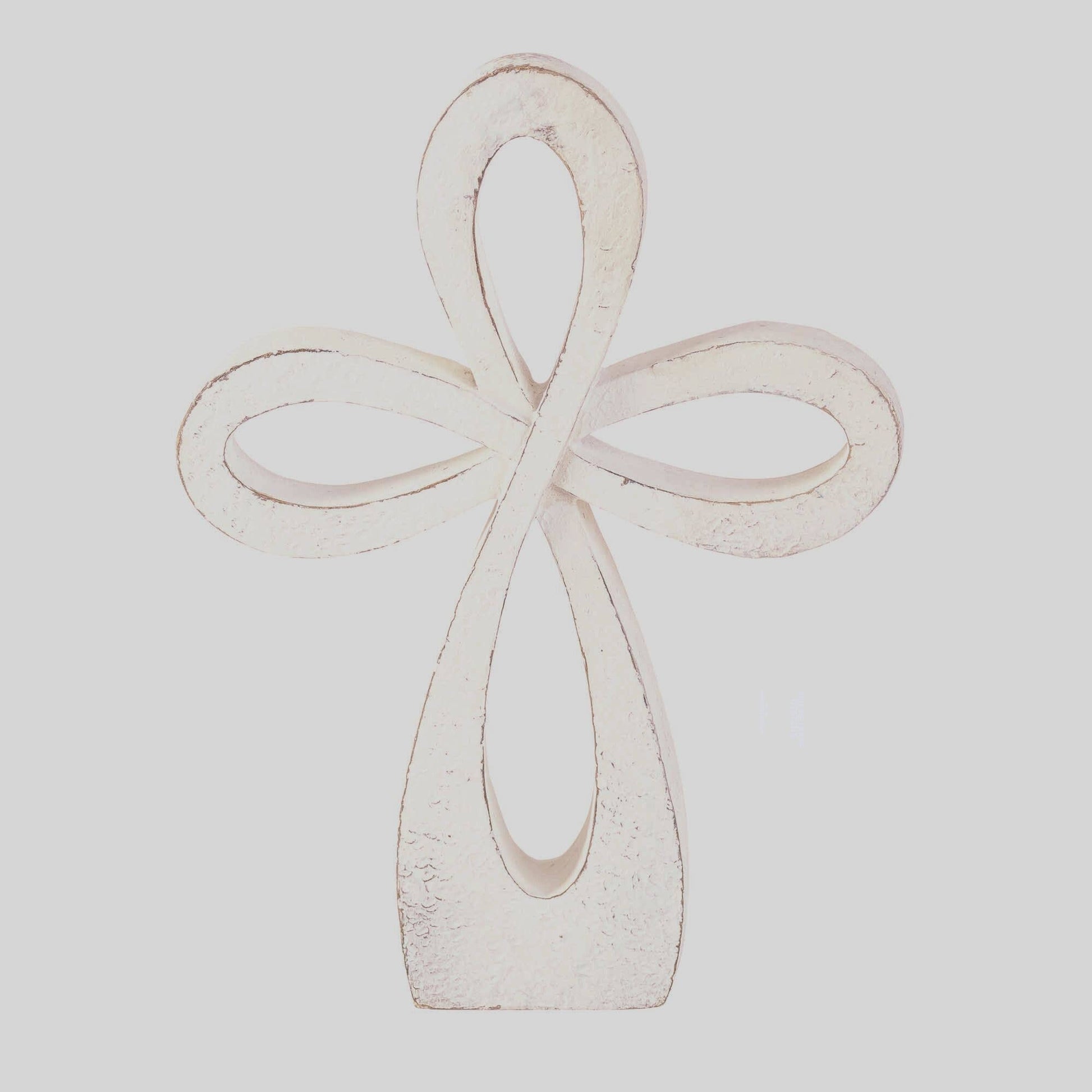 Graceful loop style tabletop cross has a distressed whitewash finish. Height is 8". Made of resin.